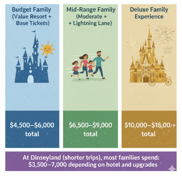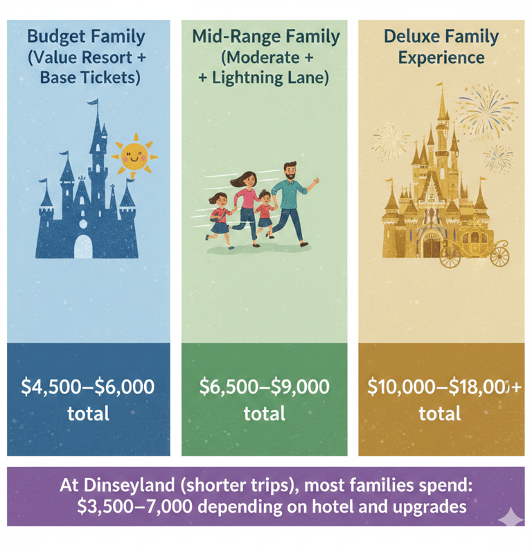 Most families spend between $5,000 and $9,000, depending on resort category and add-ons.